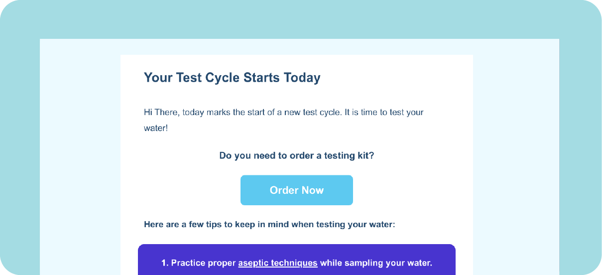 Clear™ keeps you on schedule with just-in-time email reminders, ensuring you never forget to test your water, swap a straw, or complete a spore test!